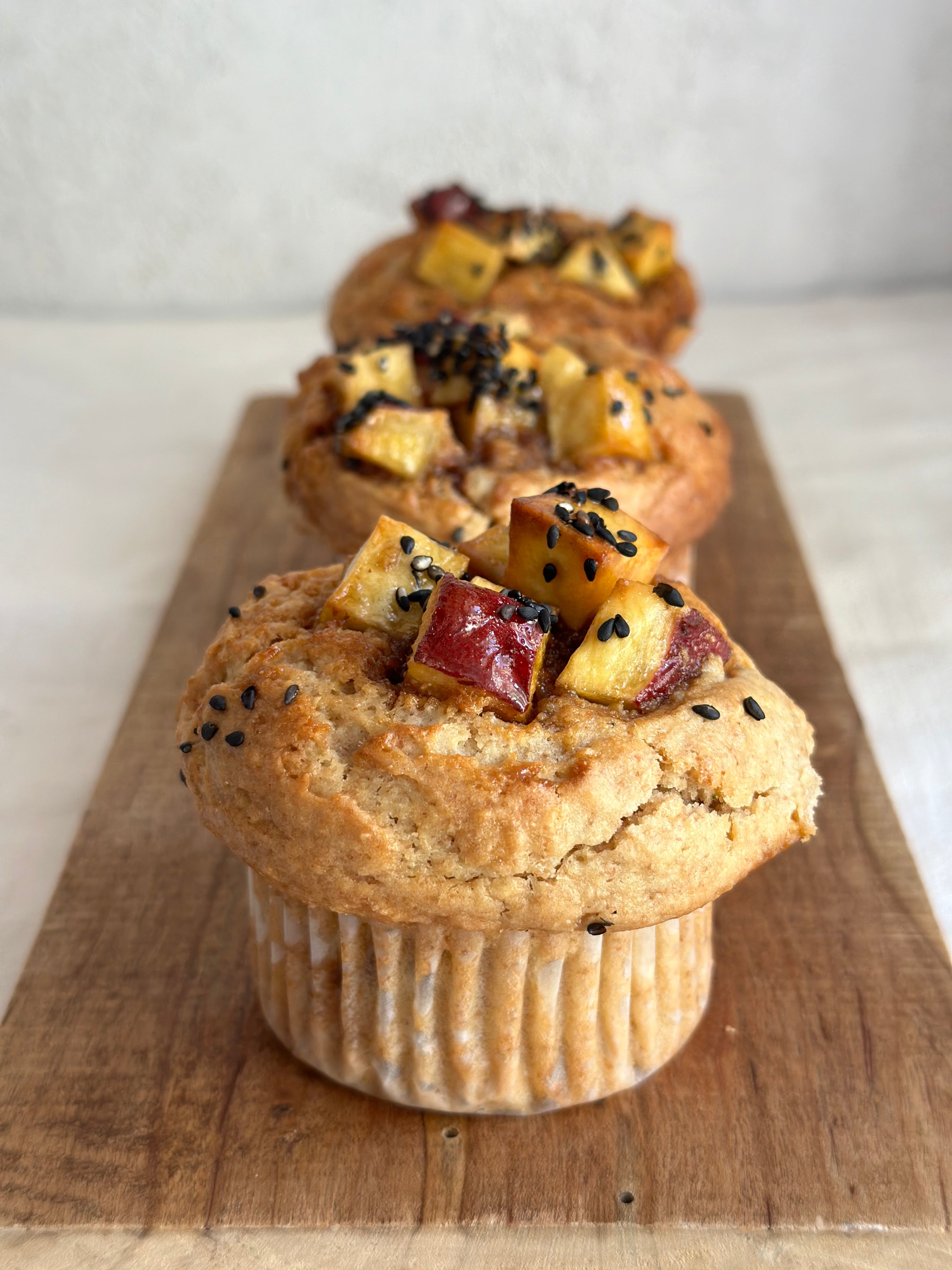 玄米水飴でつやっと仕上げた大学芋を、マフィンの中と上にたっぷりのせた秋冬限定マフィンです。
